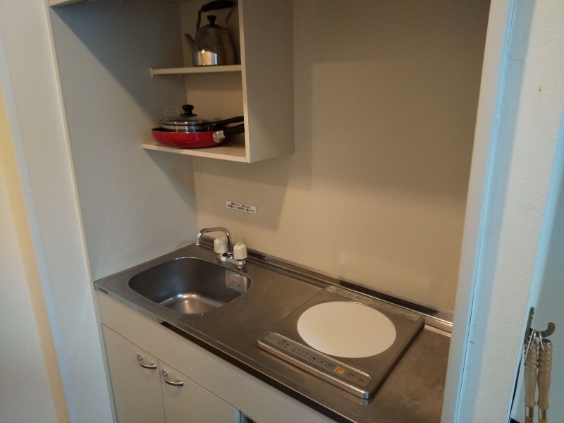 流しと電気コンロだけですが(食器も完備)、これだけでもかなり便利です。