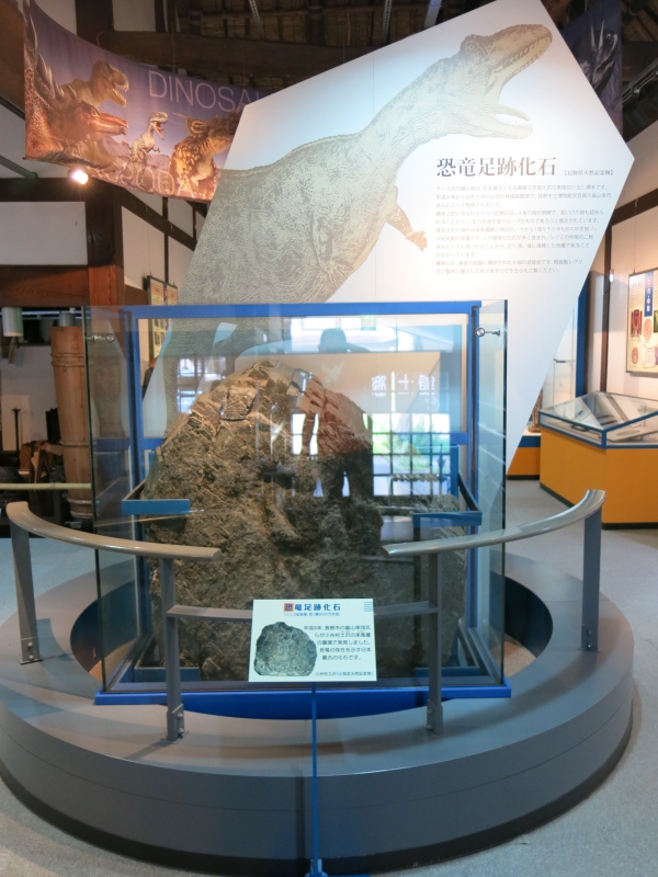 入館すると真正面に恐竜のオブジェと足跡の化石(レプリカ)がでんと置かれており、印象的でした。
