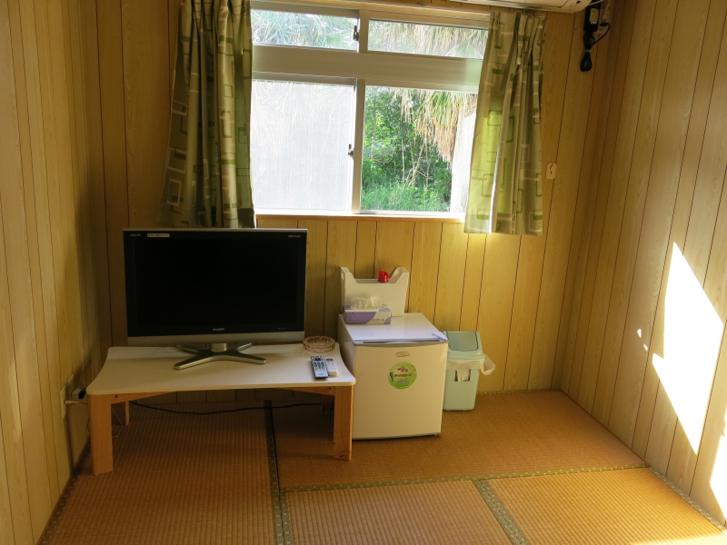 以前は食事つきでしたが、現在は素泊まりのみ。部屋は笑えるほど簡素。6畳一間にテレビと小型冷蔵庫があるだけ。アメニティ類もタオルもポットもありません。トイレとシャワーは共同かつ別棟ですから、その都度サンダル履いて外に出なくてはいけません。