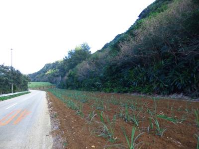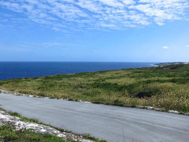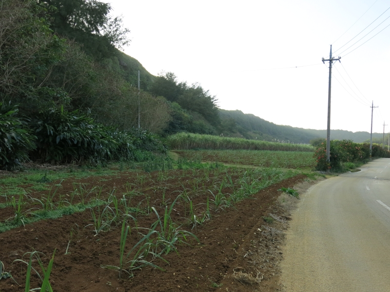 島の北西部、さとうきび畑と海岸線を区切るような景観です。