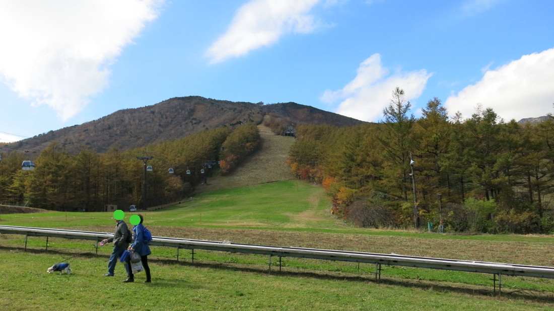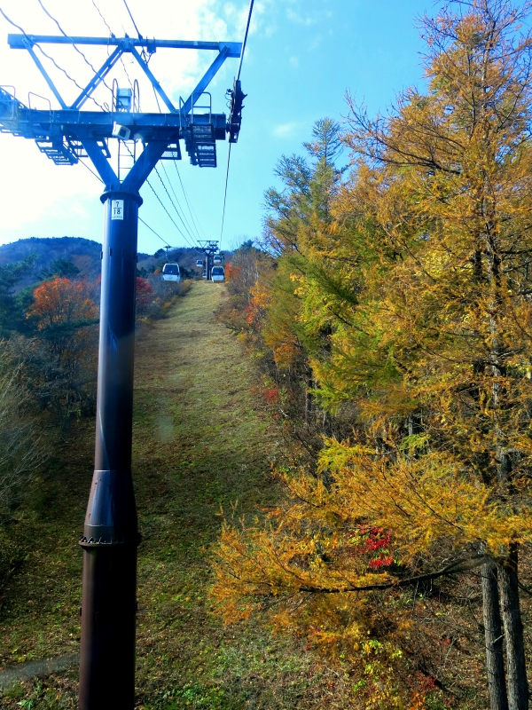 あだたら山ロープウェイから見るゲレンデの紅葉が意外にキレイで、バックとなる山の紅葉とのコントラストも楽しませてくれました。