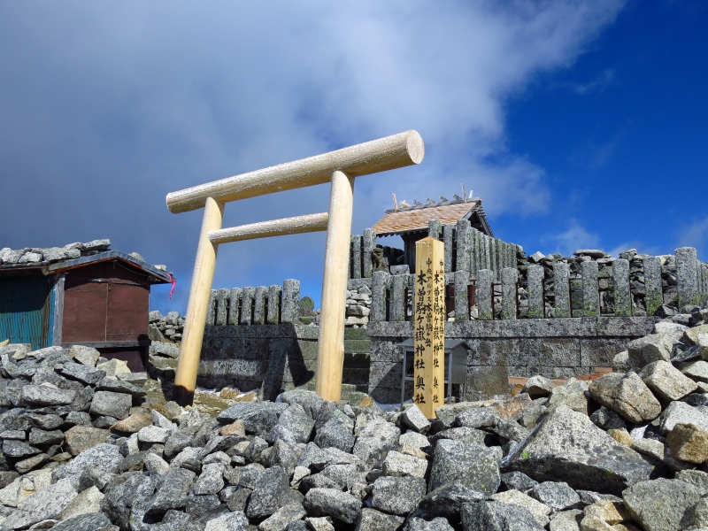 山頂には2つの祠があります。最高峰なだけに360度の眺望、中央アルプスの山々を眺めることができます。