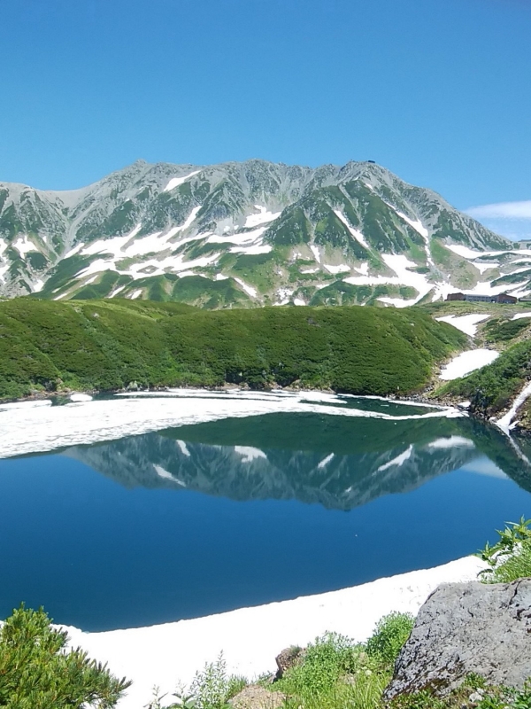 7月でも湖面には若干雪が残っていましたが、紺碧の水面に立山の主峰雄山が映されて、それはそれは見事な景観です。