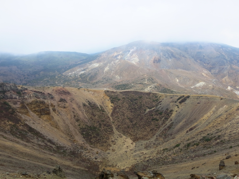 浄土平の駐車場から登り口があり、10分程度で火口のふちに辿り着きます。そこから眺める景色は猛々しい火山の景観。
