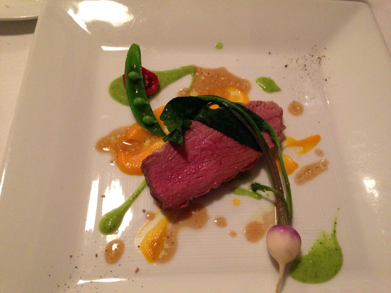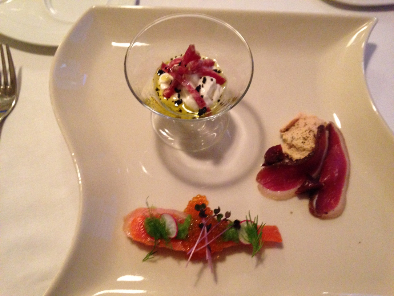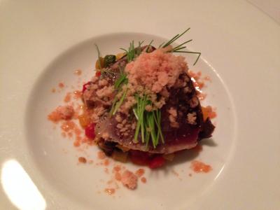 前菜盛り合わせは新玉ねぎのムース、スモークサーモン、鴨にフォアグラムースが載った物で見た目もキレイだし色んな味が楽しめて嬉しいです。次にメイン前菜?とでも言いましょうか、カツオのお刺身の下に野菜のカポナータが敷いてあり上には透明のバルサミコ酢のジュレ、更にトマトのソルベを掛けてくれました。爽やかな味でメインが来るのが楽しみになります~。