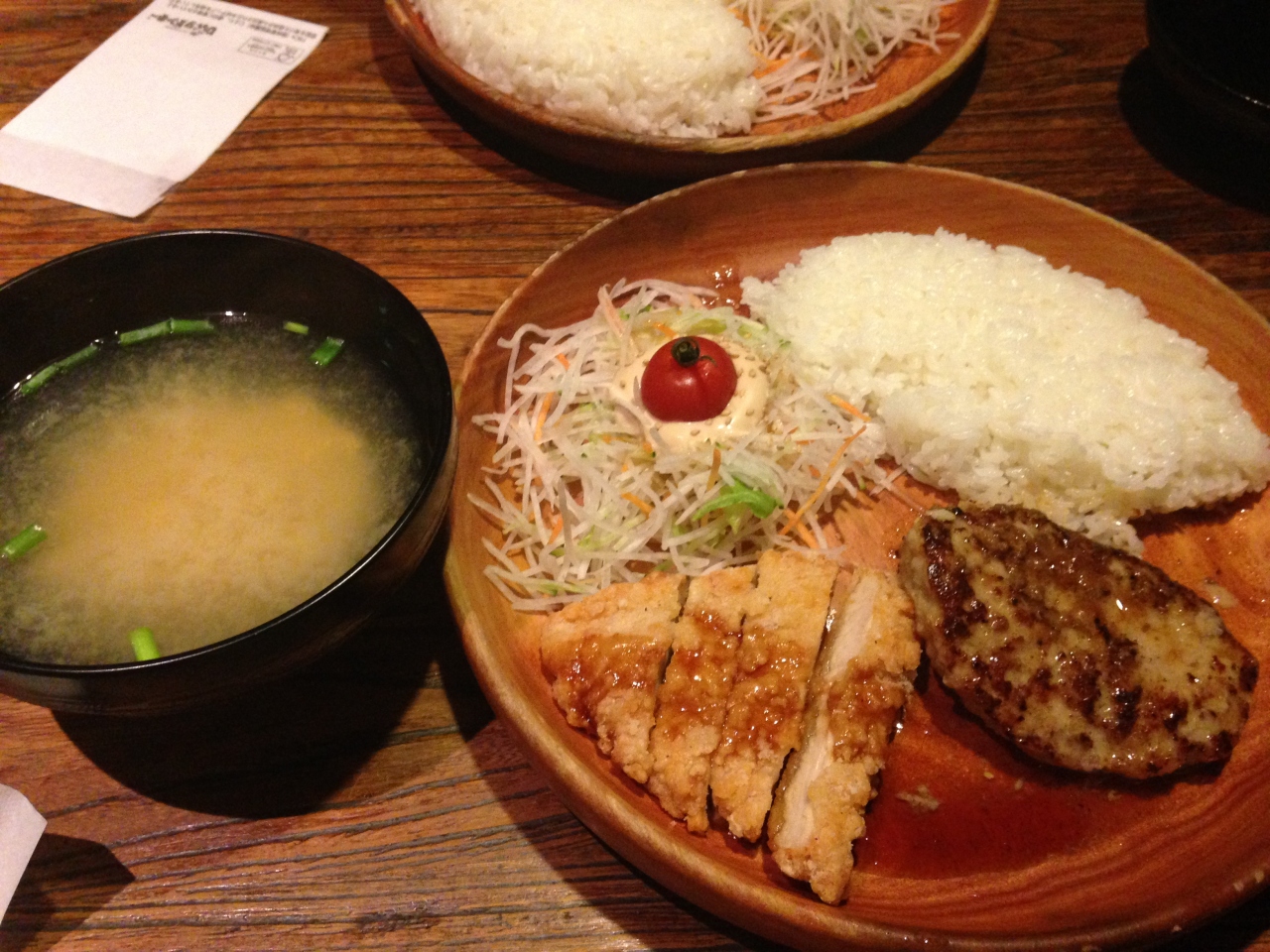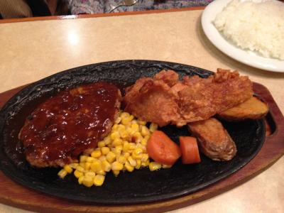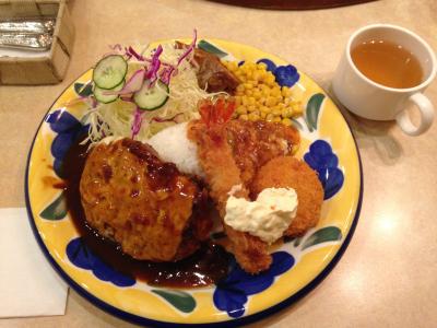 とりあえず違う物を頼んで食べました。私はハンバーグとミックスフライ、旦那さんはハンバーグと鶏のから揚げ。どちらも間違いなく普通に美味しい(というか懐かしい)定食でした。スープが付いてくるのですがかなり薄味のスープで、旦那曰く「これまた懐かしい」とのこと。昔からこしょうをたくさん入れて飲んでいたそうです。それでもお客さんも割と多く、年代もバラバラで老若男女いらっしゃいました。