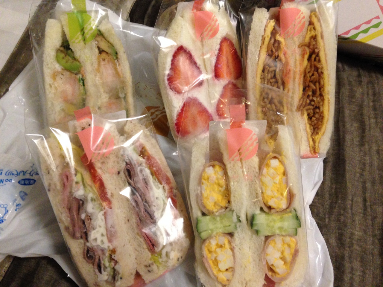 私たちはオムそばサンド、あまおう苺&生クリーム、自家製ローストビーフ、エビ&アボカドサンド、ハムエッグの5種類を購入。見ているとこれもこれもと卑しく買い込んでしまいました。