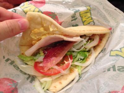 簡単にランチにしようと思いサブウェイに。色んな種類があって迷いましたがターキーベーコンエッグをオーダー。パンが初めて選んだ蒸しパンのようなモチモチした食感のパンで美味しかったです。その他トッピングはすべて入れてもらいました。