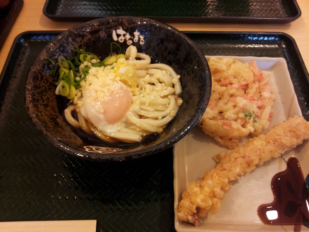 とにかくすぐに食べられるというのが良いです。うどんもコシがあって食べごたえがあります。小でうどん1玉、中なら2玉なのでいつも小にします。ぶっかけ温玉(冷)の小が人気メニューだそうで300円です。今回はそれにしてみました。いかの天ぷらとかきあげをプラスしても500円とちょっと。安いですねぇ。天ぷら各種以外にもおいなりさんも置いてありました。