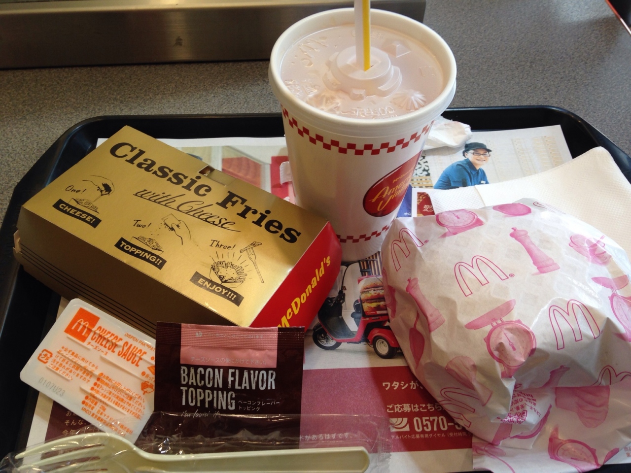 ちょうどCMでやっているハンバーガーとチーズソースをかけて食べるクラシックフライのセットにしたら780円もしてビックリ!久々に食べたら結構良い値段なんですね…。普通に定食を食べられるくらいだ…。