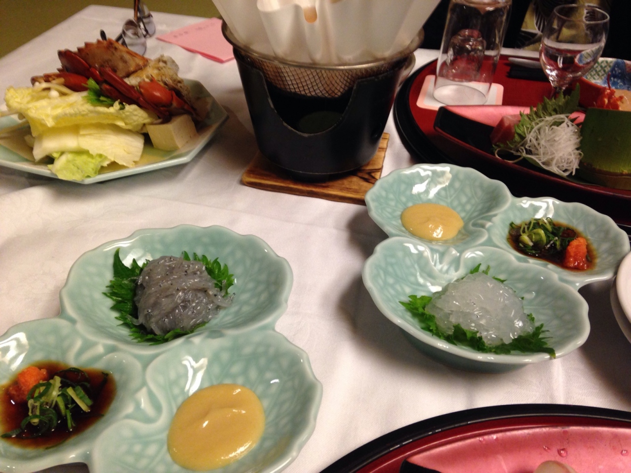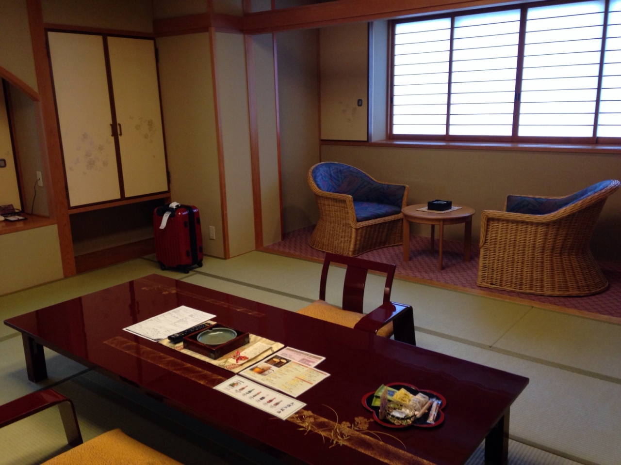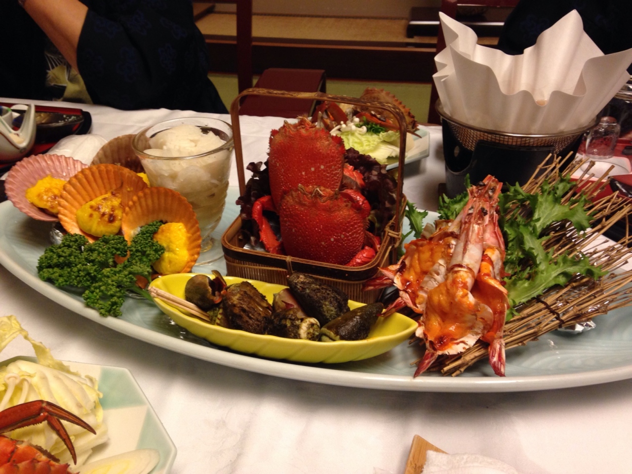 年配の両親を連れていたので部屋は広め(10畳以上7室限定「七草の章」)、また部屋食のプラン「豪華!海老・蟹・鮪・鰹会席〜紅の幸〜」を選択しました。お部屋はホントに広くてゆったり休めました。嬉しかったのはお茶受けのお菓子が7種類も置いてあった事。こんなに色々と置いてあるのは初めてみました。