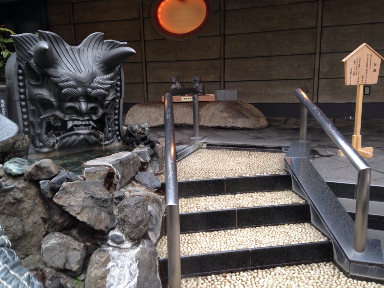 入口には足湯が出来るようになっています。ロビーに入ると文字が流れる滝がありました。