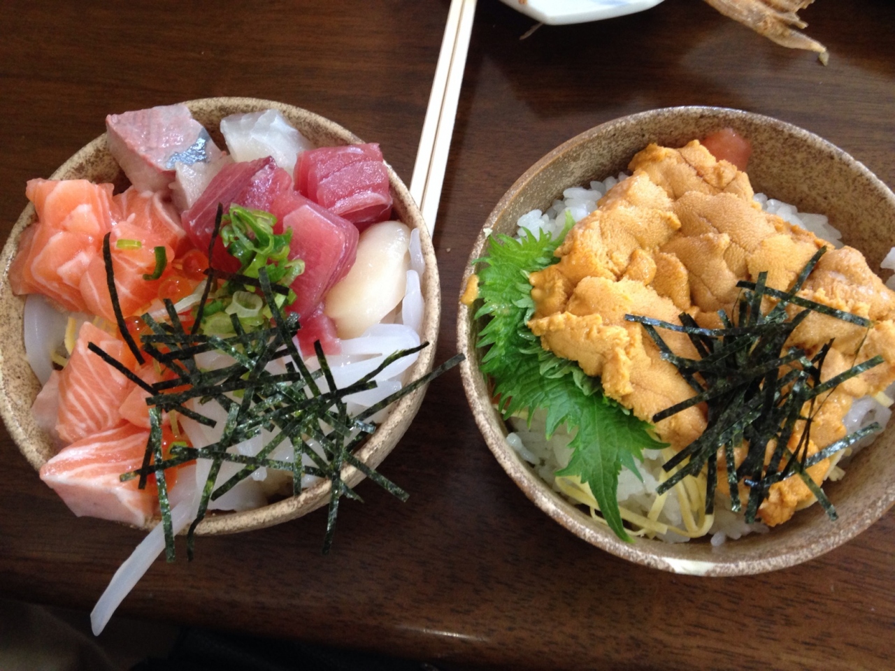 壁に貼られたメニュー表から丼をまず選びます。海鮮丼(380円)、うに丼を注文してから、店内のカウンターに並んでいるおかずから魚のフライや煮付けなどを選べます。どれもとてもリーズナブルで丼はお茶碗を大きくしたくらいの小どんぶりですが、500円しないのは驚きでした。交通費の方が高かった!- 旅行時期