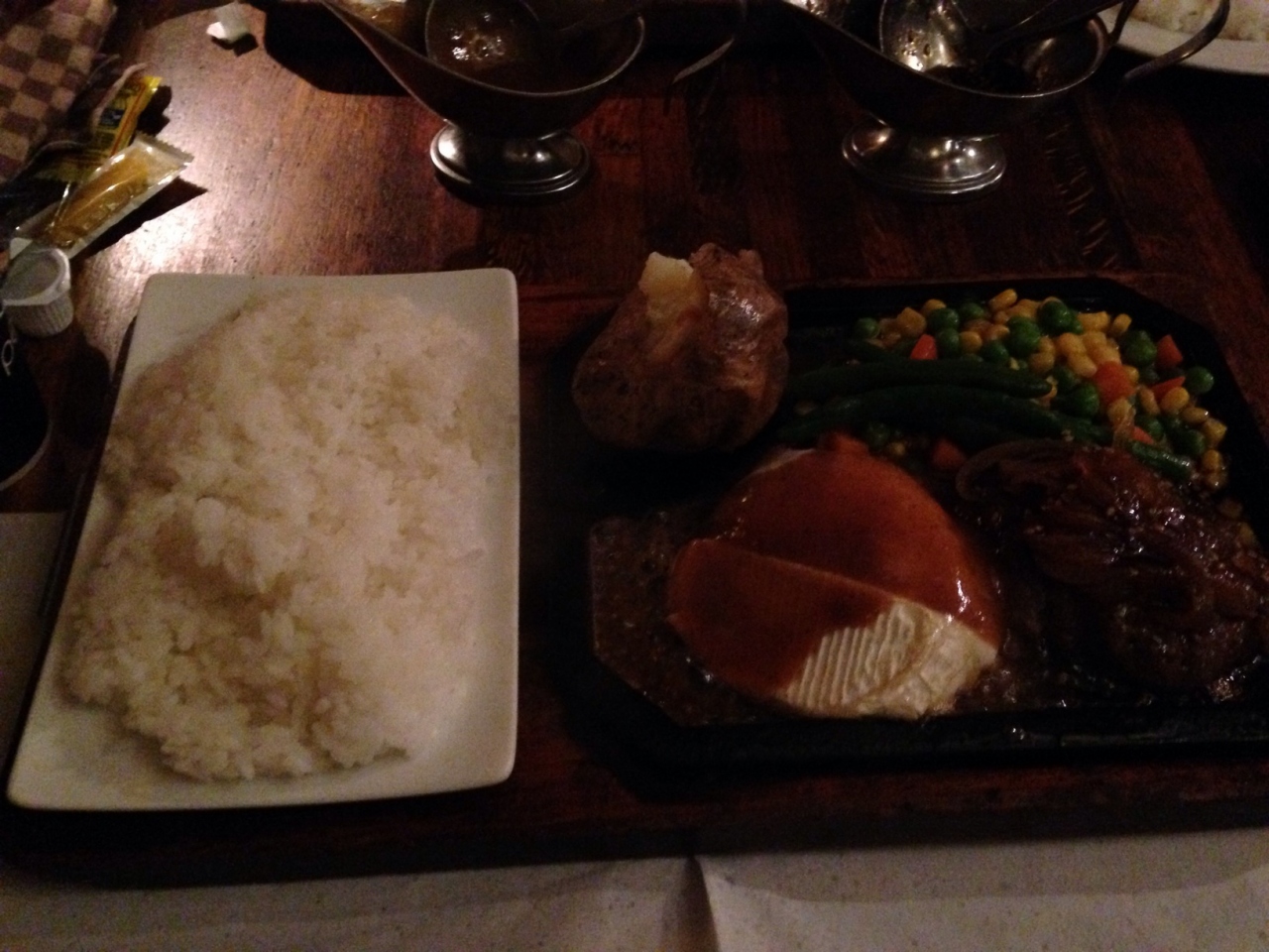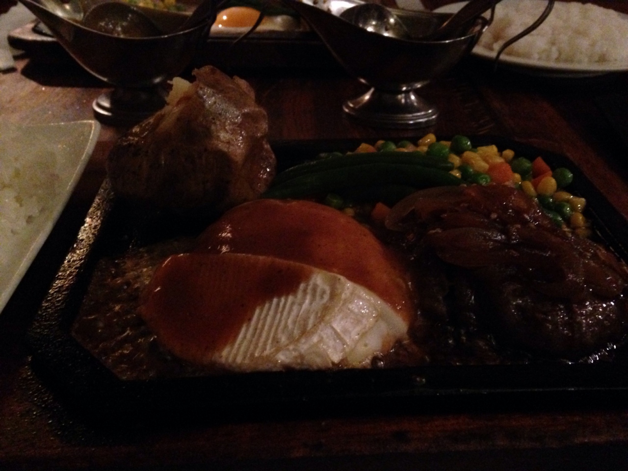 肝心のハンバーグはあつあつの鉄板に載せて提供されます。メニューも色々あって悩みましたが、カマンベールチーズが載った物とトマトのハンバーグにしました。ジューシーでチーズが効いていて旨い~!サイズはレディースセットだと私にはちょっと物足りなかったです。デザートを自由に一つ選べるのですが、デザートコーナーに自分で取りに行くシステムは少し驚きでした。飲み物も紙コップが渡されて自分で取に行くようになってます。お客さんには若い人が多かったのでこういうのでも良いのかな。- 旅行時期