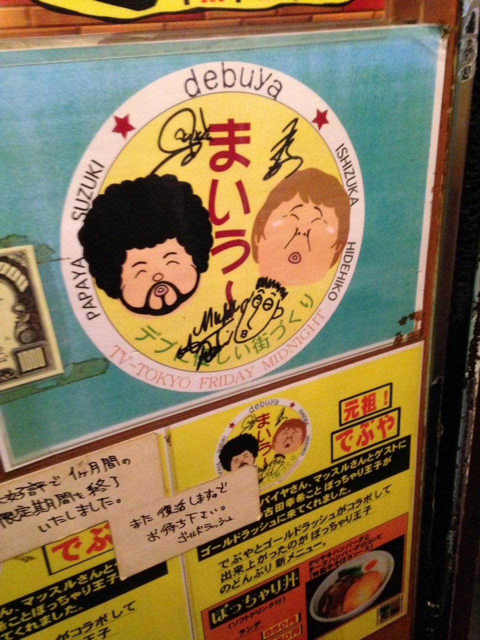 エレベーターを降りるとすぐに石ちゃん&パパイヤ鈴木のまいうー色紙などがずらり。ますます期待が高まります。