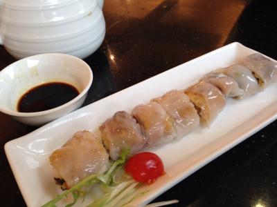 お茶のポットが出てきます。注文は自分でオーダー用紙に書き込みます。二人で焼きカキ、エノキの炒め物、お粥、腸粉、エリンギと魚の炒め物を注文。量もちょうど良く、どれも日本人の口に良く合います。腸粉は米粉で出来たもちもちの皮で油条のような揚げパンを巻いているもので、中はサクサク、外はモチモチでとっても美味しいです。