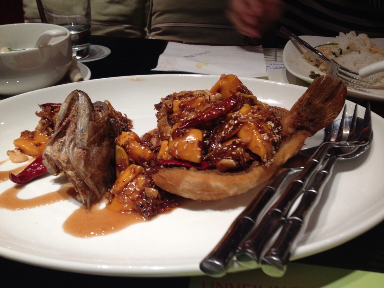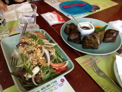 レストランが幾つか入っている中でSymply Thaiでタイ料理を頂きました。店内はさすがに新しくてキレイ。スタッフがまだ慣れていない感じでした。いつも似たようなメニューになるので、今回は魚をチョイス。大きな魚一匹を揚げたものにマンゴー、小魚などが入った甘めのソースが掛かっていて美味しかったけど、ずっと食べているとくどくなってきました…。二人で食べるには大きすぎたかな。この他、トムカーガイ、カレーを頂きました。美味しかった!そうそうここは無料のお水が無いのでミネラルウォーターを頼む必要があります。それから食前につきだしのような揚げたエビセンが出てきてこれまた美味しいです。- 旅行時期