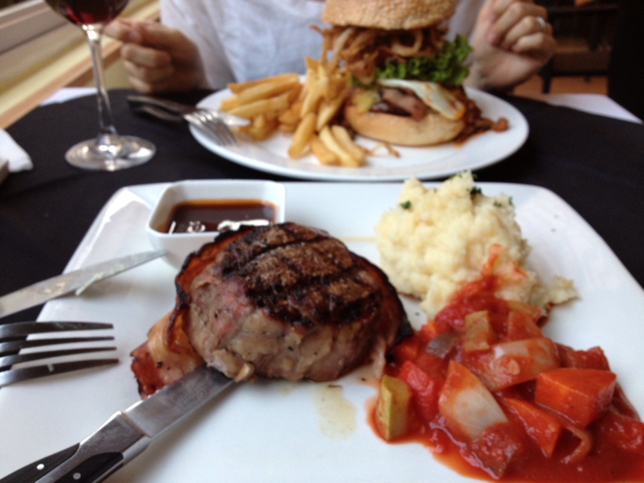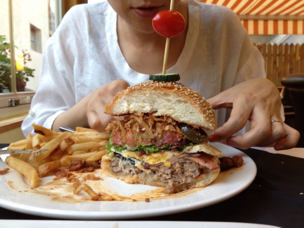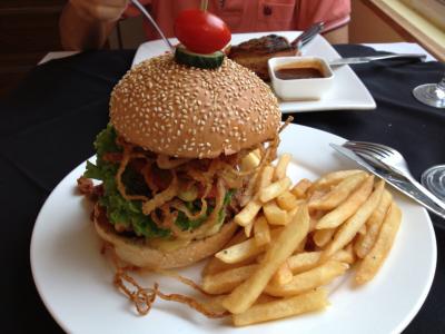 かなり混んでいるとのことで予約して行きましたが早い時間だったせいかガラガラでした。欧米人のお客さんがちらほらいたくらい。お目当てのハンバーガー(マンハッタンハンバーガー)とヒレステーキを注文。ハンバーガーには色んな種類があってテリヤキやらヤンキーやら他にもアメリカの地名が付いたバーガー類があって悩みます。今回のは見た目もド派手であまりの分厚さに驚きました~。味も抜群。今まで食べたバーガーの中で一番美味しいんじゃないだろうか。ステーキの方も付け合せのポテト、トマトソース味のお野菜なども美味しく、こちらも大満足でした。