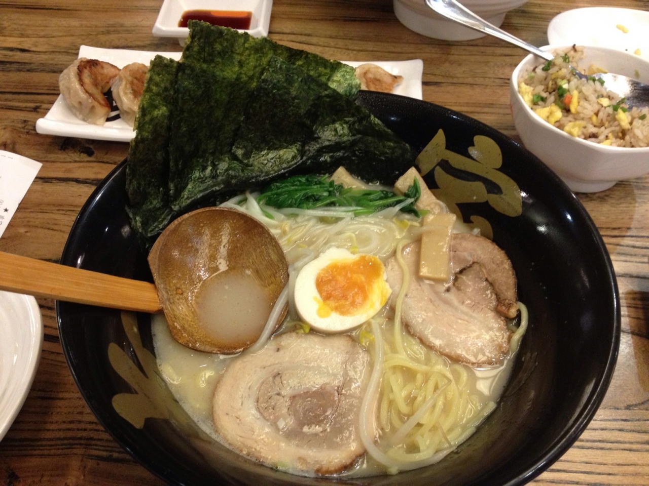 ラーメンはとんこつなのですが、黄金ラーメンと塩味ラーメンを一つずつ頼んだら見た目はほぼ同じ、味も一瞬変わらないように思えましたが、塩味の方だけ若干塩味を強く感じました。でもかなり美味しかったです。餃子の方は野菜多めのアッサリ味。ビール飲みながらとかだったらたくさん食べてしまいそうでした。こちらもなかなかGood。