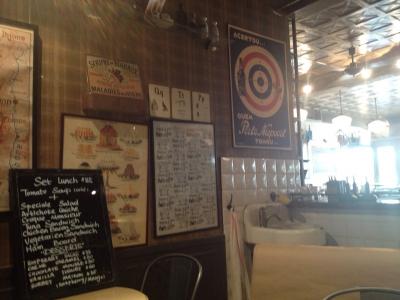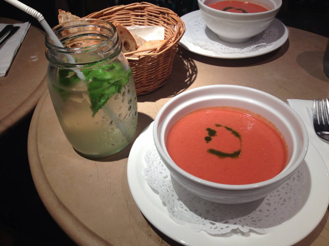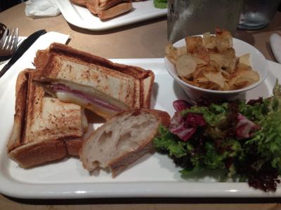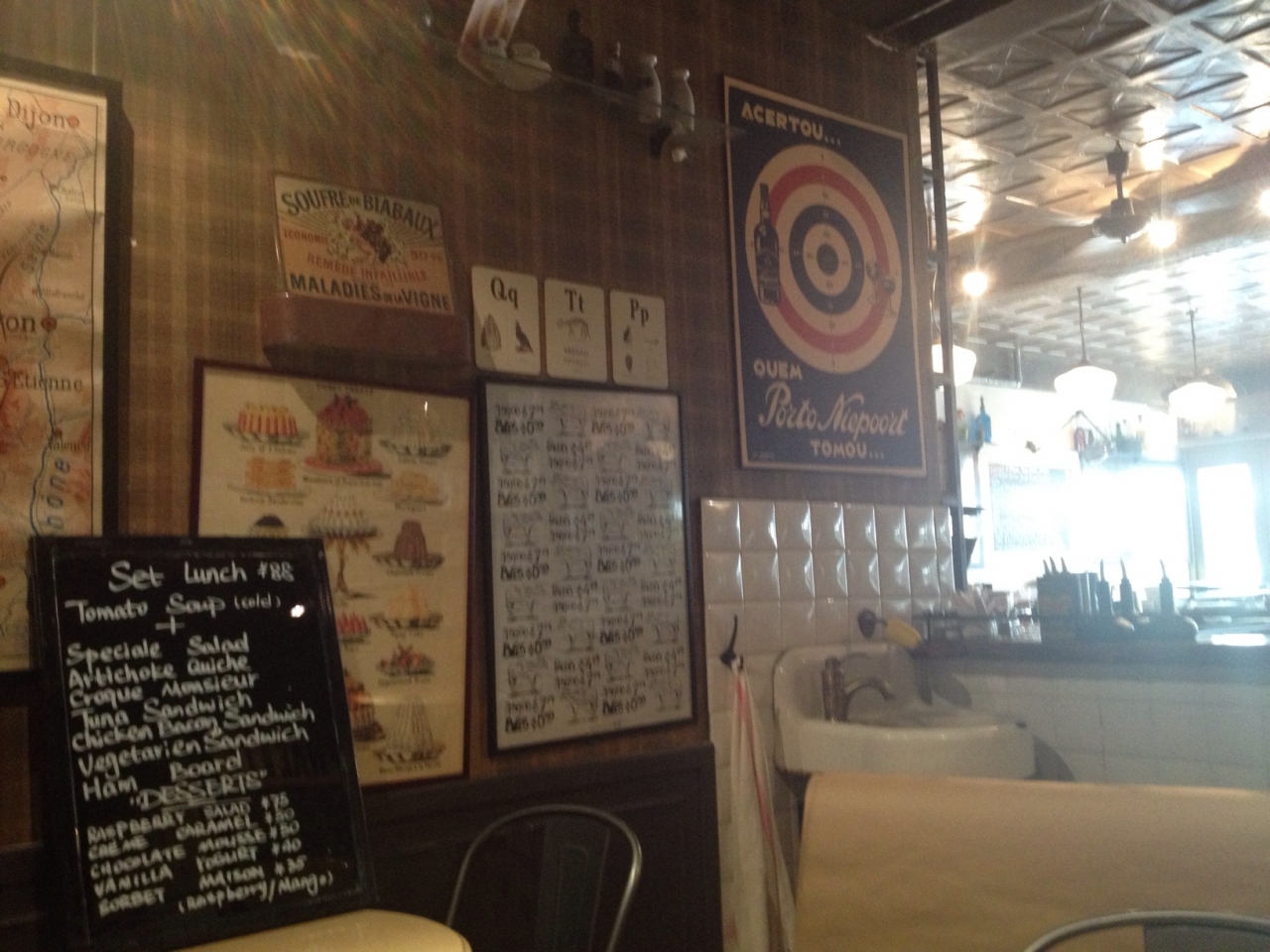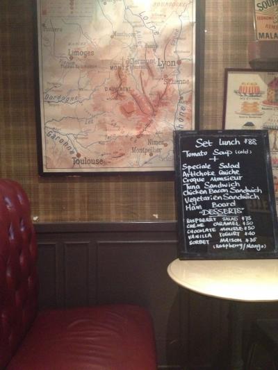 ランチはメニューボードから選ぶのですが、スープ+サンドイッチやキッシュ、サラダを選んで88元。コーヒーなどのドリンクは別料金なので安くはありません。私はミントソーダを注文したら可愛らしい瓶にようなグラスに入ったソーダが出てきましたがあんまりミント味は強くありませんでした。この日のスープはトマトの冷製スープ。これが少しガーリックが効いていて冷たすぎず、すっごく美味しかったです。メインはクロックムッシュにしたのですがハムとチーズが多くて最後は少ししつこく感じるほどで全体的にボリュームがありました。次はお隣のビストロFranckさんへ行ってみたいなー。- 旅行時期