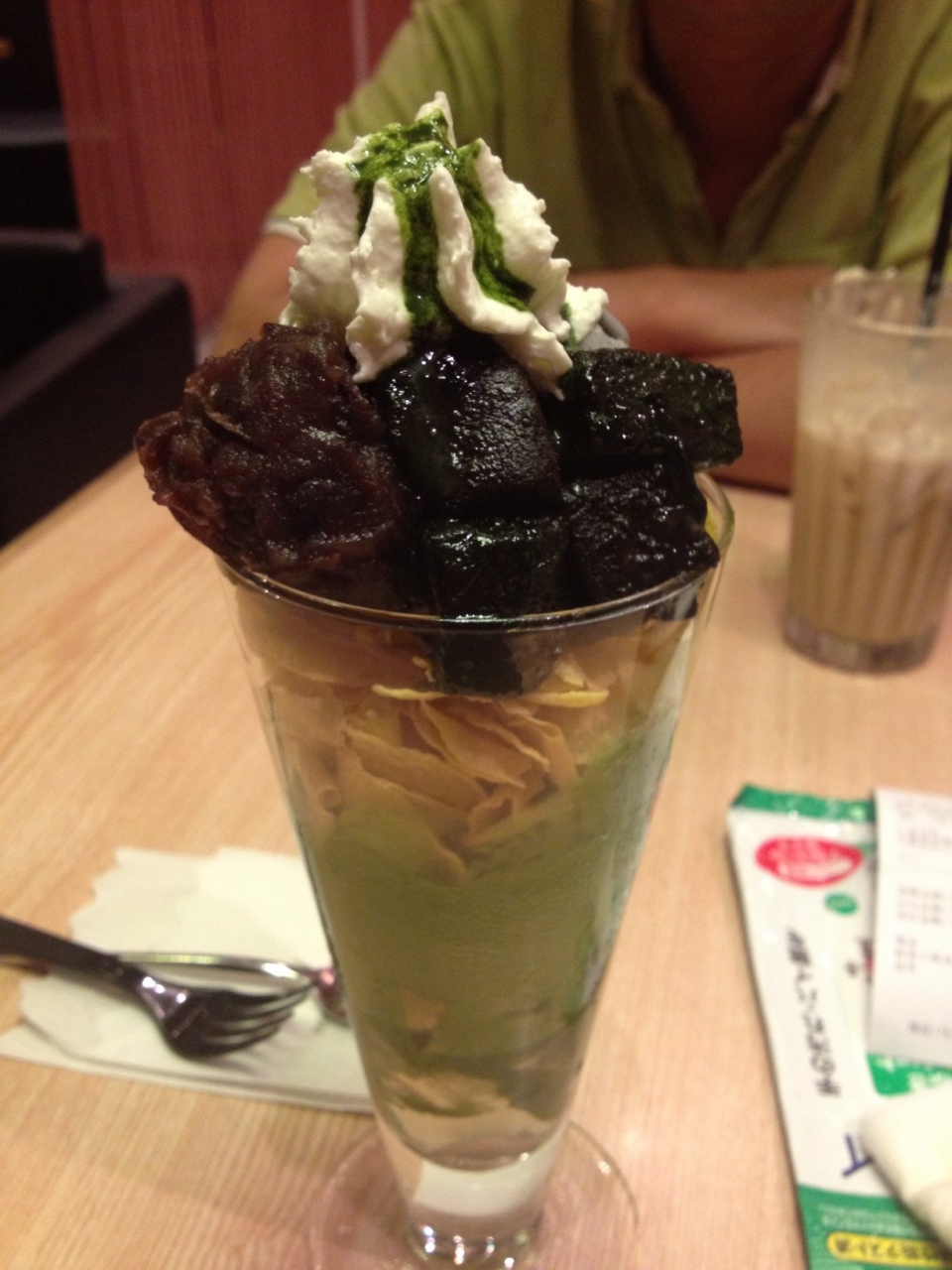 私は一番人気と言われるパフェを、夫はキャラメルマキアーノとかいうドリンクを頼みました。このパフェ、抹茶アイスの他にごまアイス、あんこ、黒いわらび餅と盛りだくさんで大満足でした。