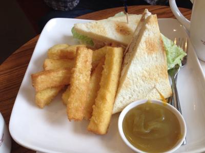 お店でカヤトースト単品、サンドイッチセットをオーダーしたらセットにはゆで卵とコーヒーがついてきます。茹で卵のゆで加減を聞かれたので5分熟(半分火が通った感じ)と言うと、殆ど火が通ってないくらいの卵が出てきました。フライドポテトに見える物はパンを揚げたもので、一緒についてくるカヤペーストにつけて食べるものです。カヤトーストにはバターとカヤペーストが挟まれていてカロリー高そう。でも美味しかったです。コーヒーもブラックとかはなく、砂糖とミルクがあらかじめ入った濃いめのコーヒーが出てきます。