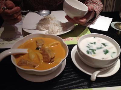 週末のランチに友人家族と行きました。ランチセットみたいなものが無いので、色んな種類を取ってシェアすることになります。メニューは値段と比較するとそれほどのボリュームは無いかもしれません。オーソドックスなタイ料理のヤムウンセン、トムヤンクン、ココナツカレーの他に、葉っぱで包まれたチキンなどを頂きましたがどれも美味しかったです。