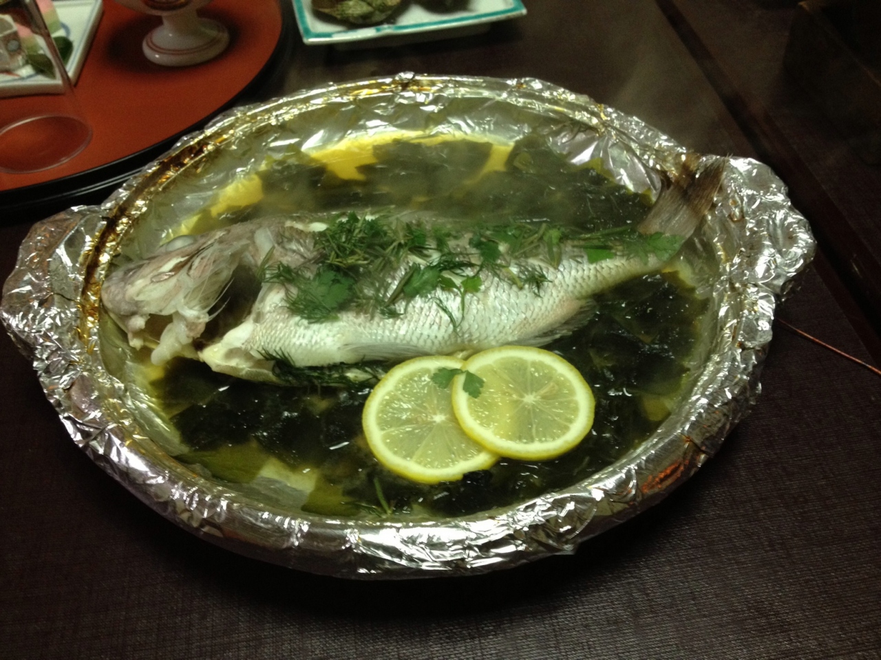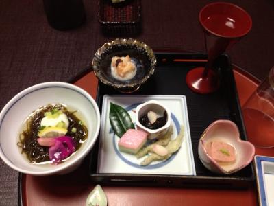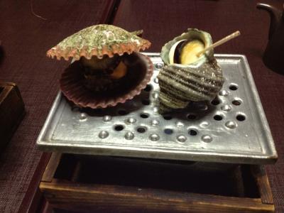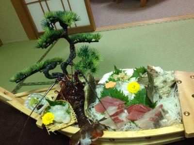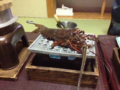 夕食は部屋食となっていて、海鮮料理が山ほど出てきました。刺身の舟盛りは大きくはありませんが、鯛まるごと使った蒸し物、伊勢海老と鮑の踊り焼き、揚げ物、煮物、伊勢海老の具足煮に加えてうにご飯。お腹がはちきれそうになりました。鯛の蒸し物は余っても次の日の朝にしょうゆで炊いて出してくれます。私たちは鯛をほぼ全て食べてしまったので朝は鯛の頭だけ出てきました…。