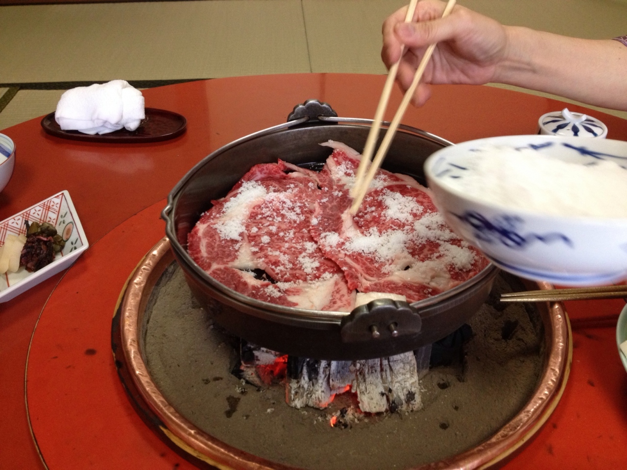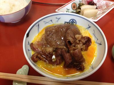 メニューからあみ焼きと寿き焼きを1人前ずつ注文。炭を熾すところからすべて仲居さんがやってくださいます。あみ焼きはヒレの部分、すき焼きはロースでそれぞれ2切れずつでした。1人前のお肉は130gだそうです。でも野菜もたっぷりついているし、ごはんはお代わりできる上に肉みそとお漬物もついてます。(赤出汁は別料金)