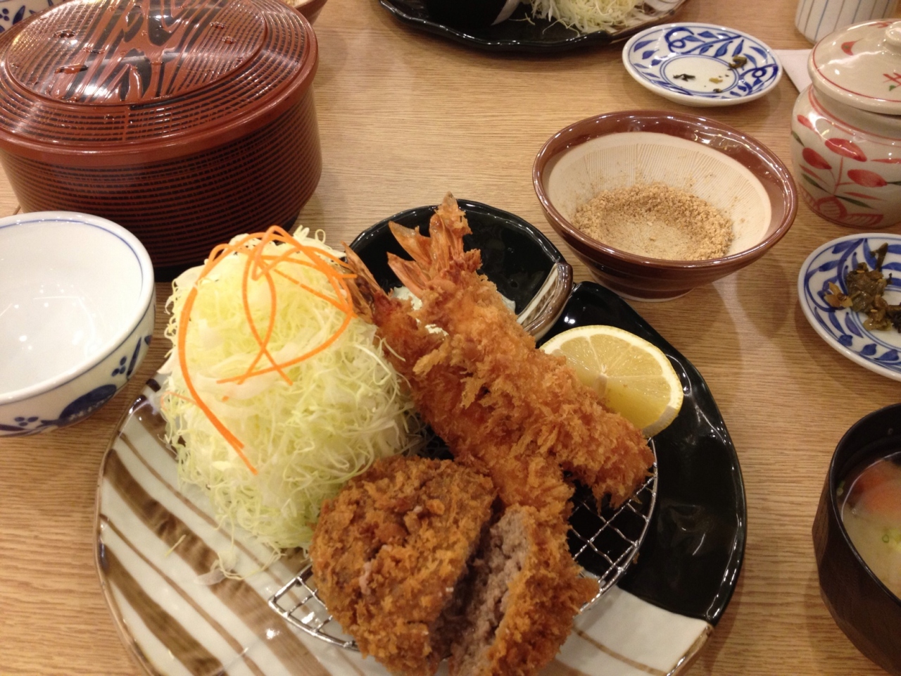 今回はメンチカツ&エビフライ定食とヒレカツ&カニクリームコロッケ定食を頼みました。ごまの入ったすり鉢が出てくるので、ごまを擦りながら待ちます。机の上に高菜が置いてあるのでそれを食べながら待つのも良し。この高菜も結構美味しいです。