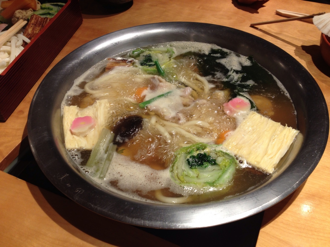 お昼から豪勢にうどんすきを頂きました。店員さんが上品なおつゆが張られたお鍋に野菜やおうどんをきれいに入れてくれます。見た目はそれほど多いと思っていませんでしたが食べおわったら歩けないくらいのボリュームでした。