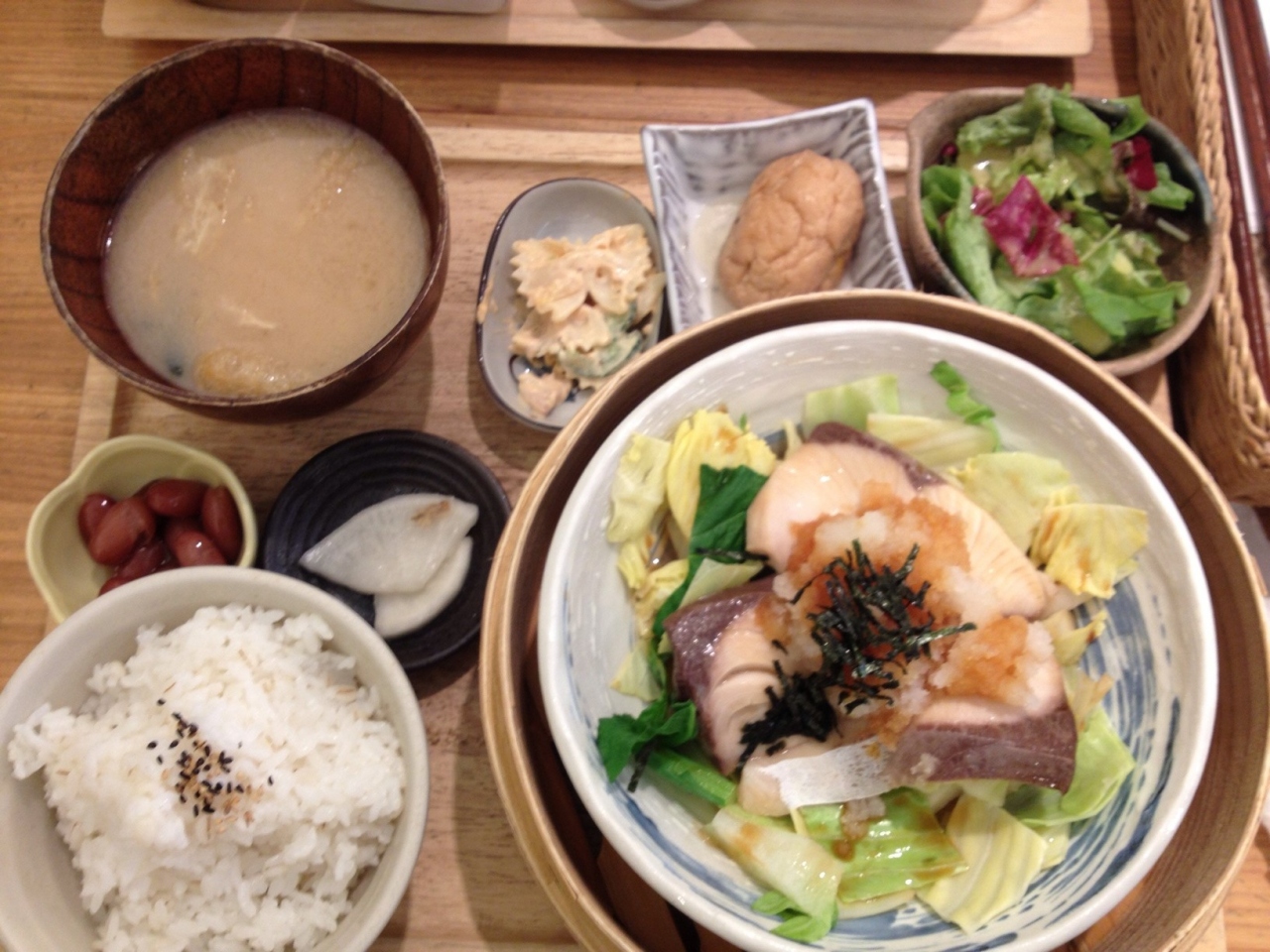 ランチには3種類ほどのメニューがあり、どれも1000円前後です。私が頼んだのはぶりの蒸し物でキャベツの上に乗ったぶりがとても美味しかったです。ポン酢味だったので家でも出来るなと参考になりました。ご飯は赤米と麦ごはん、白ご飯から選べます。赤米の方に麦も入っていたようなので今度は赤米にしようかな。- 旅行時期