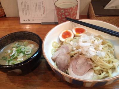 堀江近辺にあるラーメン屋さんを調べて行ってきました。開店が11時で11時過ぎには入れたのですぐに座れました。濃厚つけ麺と煮干しラーメンを注文し、つけ麺の方は麺の量を聞かれるので大中小のどれかを選択します。大250g、中200g、小150gだそうです。そして待つこと10分。煮干しラーメンはかなり煮干しの香りがします。一口目は魚臭いかなと思いましたが、食べているうちにやめられなくなります。つけ麺は麺がとても太くてもっちり、スープにたくさん絡めて食べるとサイコー。今までつけ麺と言えば魚介系の味がきつい物しか食べたことが無かったのですが、こちらのは豚骨も聞いていてまろやかなスープでした。スープを飲みながら麺を食べると更に美味しかったです。