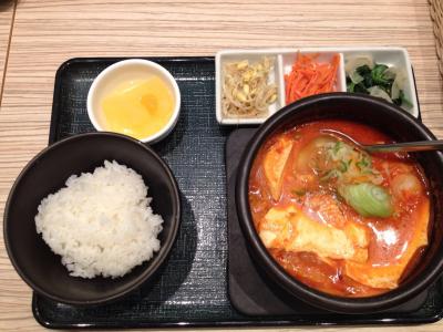 色んな種類の純豆腐があり、だしのベース、基本の具材、トッピング、辛さ、ご飯の量などが選べます。私は味噌ベースの豚肉スンドゥブ、キムチトッピングでした。写真のご飯は少なめ。ナムル、デザートもついてきてお腹いっぱいになりました。あっさりして美味しかったです。- 旅行時期