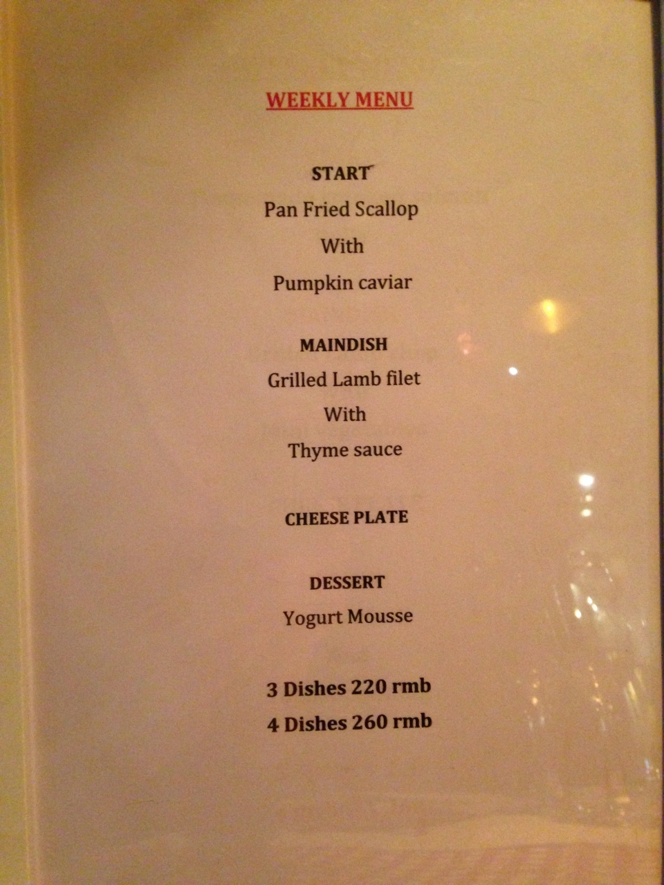 フランス人マダムと英語も話せるフランス人の男性、シェフは中国人のようでしたがフランス語を話しているようでした。メニューが良く分からず前菜のプラッター、ホタテのグラタン、牛肉のカルパッチョをオーダー。ワインはグラスでブルゴーニュ産とか説明してもらいながら選びました。WEEKLY MENUはその週のお勧めなのでもう少し分かりやすいかもしれません。そして少し割安かも。ここはワインやお酒を楽しみながらゆっくりとチーズや一品料理を頂くのが良いようです。パンはいくらでもお代わりできますが、それ以外の主食のようなパスタとかご飯みたいなメニューはありませんでした。私たちも片言の英語しか話せませんがとても楽しく過ごせました。- 旅行時期