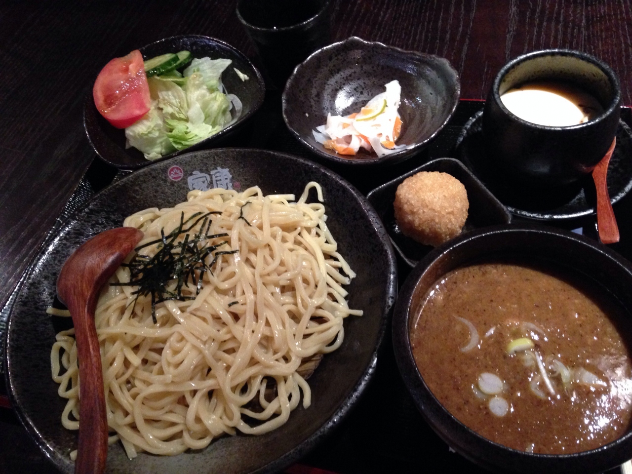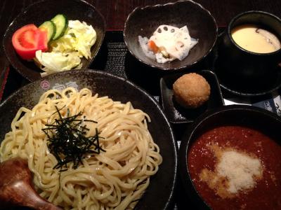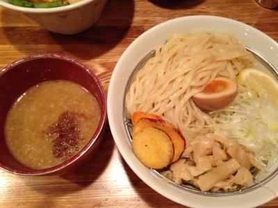 お店の中は結構広くて座敷席などもありました。夜は居酒屋になるようで色んなメニューがありました。お昼はつけ麺、ラーメンが主ですが、つけ麺は定食のようになっていて茶わん蒸しなどがついています。これが余計かなぁと思います。つけ麺単品でもう少し安くしてほしい。肝心のつけ麺ですが、一番最初にみそ味と書いてあったのでお勧めかと思いみそ味を注文。もう一つトマトチーズを注文しました。スープはどちらもドロッとしていて麺に絡みやすいです。みそはみそ味がしっかりしています。トマトの方は殆どトマトソースのパスタという感じ。麺も平べったくてつるつるもちもちで美味しかったですが醤油味にすれば良かったかなと思いました。- 旅行時期