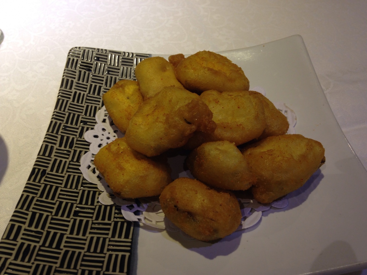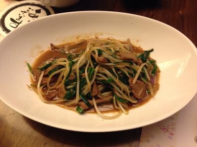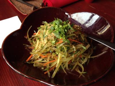 写真付きのメニューなので分かりやすいです。前菜のなすのフリッター。北京ダック半羽(78元=およそ1300円)、海鮮入りの豆腐スープ、ユリ根とホタテの炒め物、担担麺を頼みました。どれも美味しかったですが、北京ダックはちょっと残念でした。というのもお店の人が包んでくれるのですが、そのせいで全部冷めてしまって油っこく感じたからです。ただお肉を食べた後の骨の部分や、骨についた残りのお肉を「鴨二吃」という言い方で別の料理にしてくれます(有料35元)。お店の人のお勧めで塩コショウ炒めにしたら味は濃かったけどかなり美味しくて満足でした。- 旅行時期