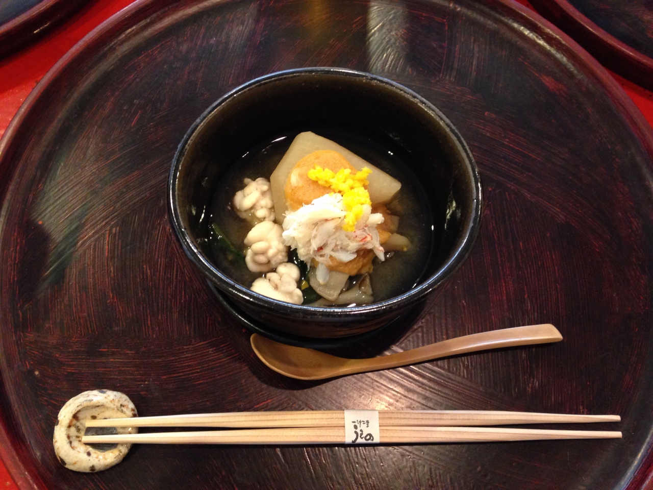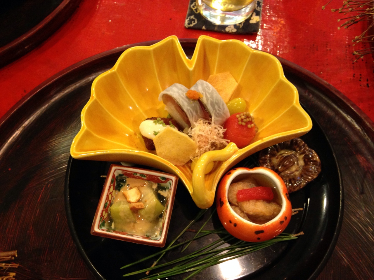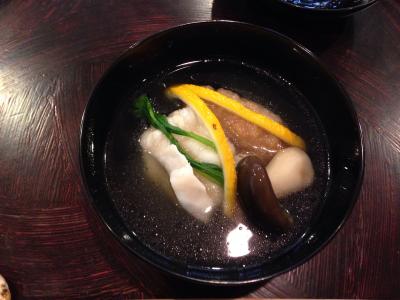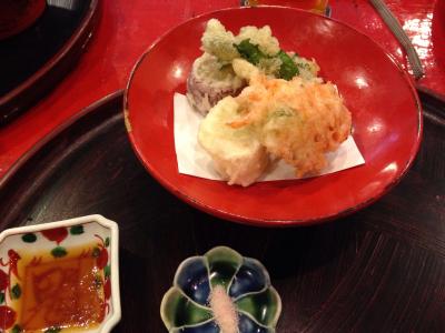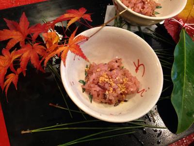 名前がはっきり分かりませんが、聖護院大根と白子のお椀、お祝いのお赤飯(めでたい、のお茶碗に盛られていました)、黄あこうとれんこん饅頭、前菜盛り合わせ、お刺身、天ぷら(蜜で炊いたさつまいも、下仁田ネギ、サクラエビ、ホタテのしそまき)、ごま豆腐、酢のもの、マナガツオの味噌焼きとお漬物の炊き込みご飯、デザート(黄粉のアイス)でした。とってもお上品な味付けで、お腹がいーっぱいになりました!ご飯が残った分は持ち帰らせてくださいました。またいつか行けたら良いなぁ。