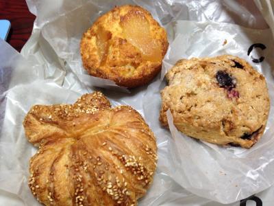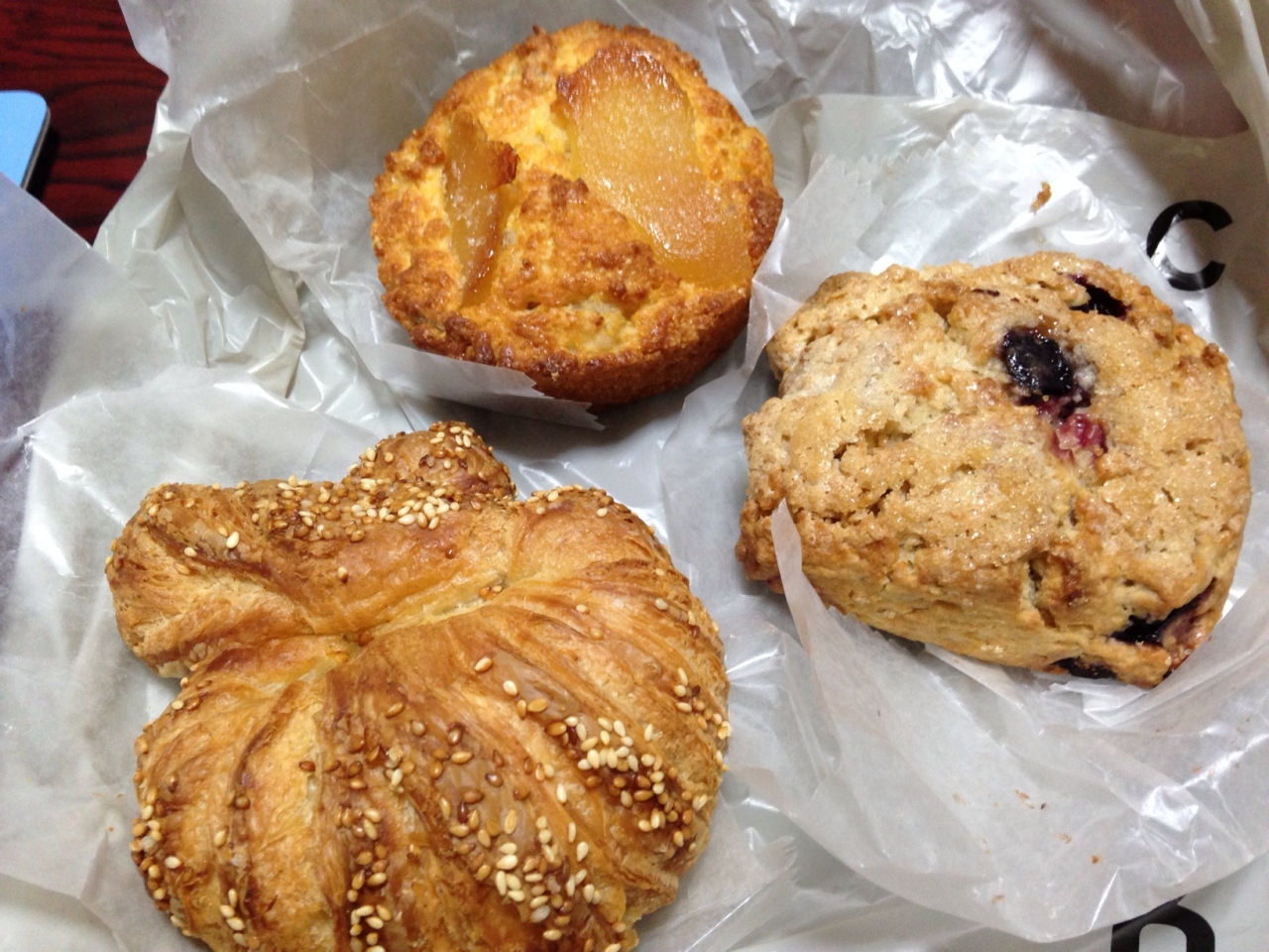 プレッツェルクロワッサンは一人2個までと書かれていて、確かに周りの人みんな2個ずつ買っていました。一つ320円もするクロワッサン?と思いましたが一つだけ購入。ジンジャーコーンマフィンのNYサイズ、ブルーベリースコーンもNYサイズを購入。3つ買ったら袋がずっしり重くなりました。