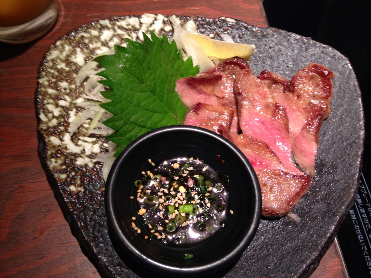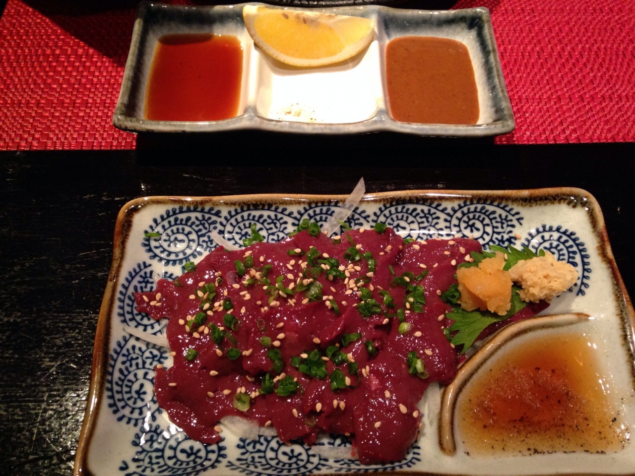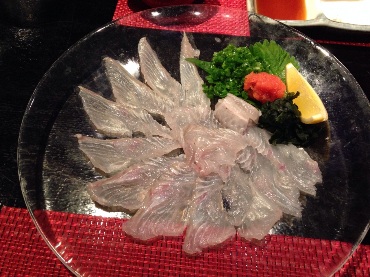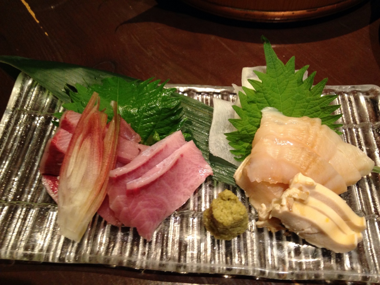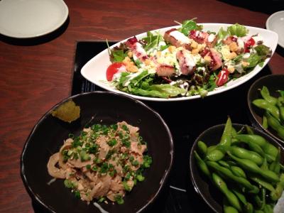 小さ目の個室に案内してもらいました。早速オーダー。名刺にも泳ぎイカと鰹の藁焼きタタキと謳われているように名物はコレなので忘れずオーダー。塩かポンズが選べます。店員さんが「今日はカツオの脂があまり乗っていないので塩はおススメしません」とのこと。何だー、ガックリ。でも頼みます。かなり分厚い鰹でした。結局お代わりしてしまいました。