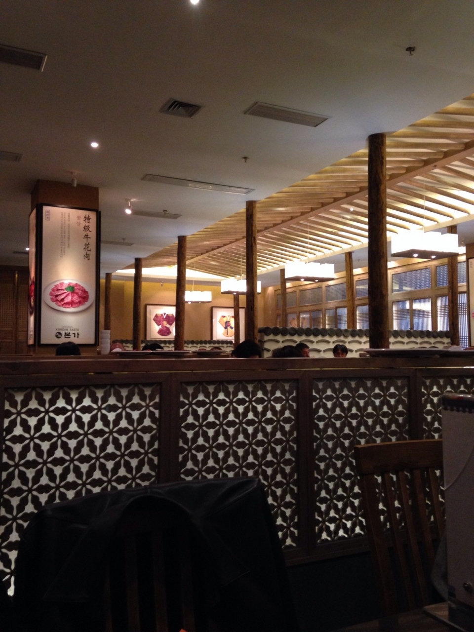 5Fまであがると屋上になっていて、そこにフェンシング練習場と本家の入口が分かれています。ちょっと変わった作りですが、入り口を入ると中まで長い廊下が続いていて韓国レストランという雰囲気が伝わってきます。夕方5時頃に行くと既にお客さんが何組もいましたが、私たちもすぐに座れました。とても広い店内でゆったり座れます。