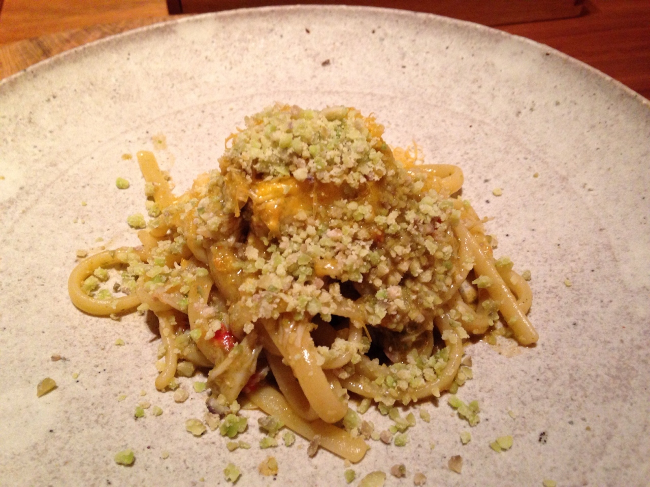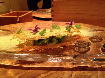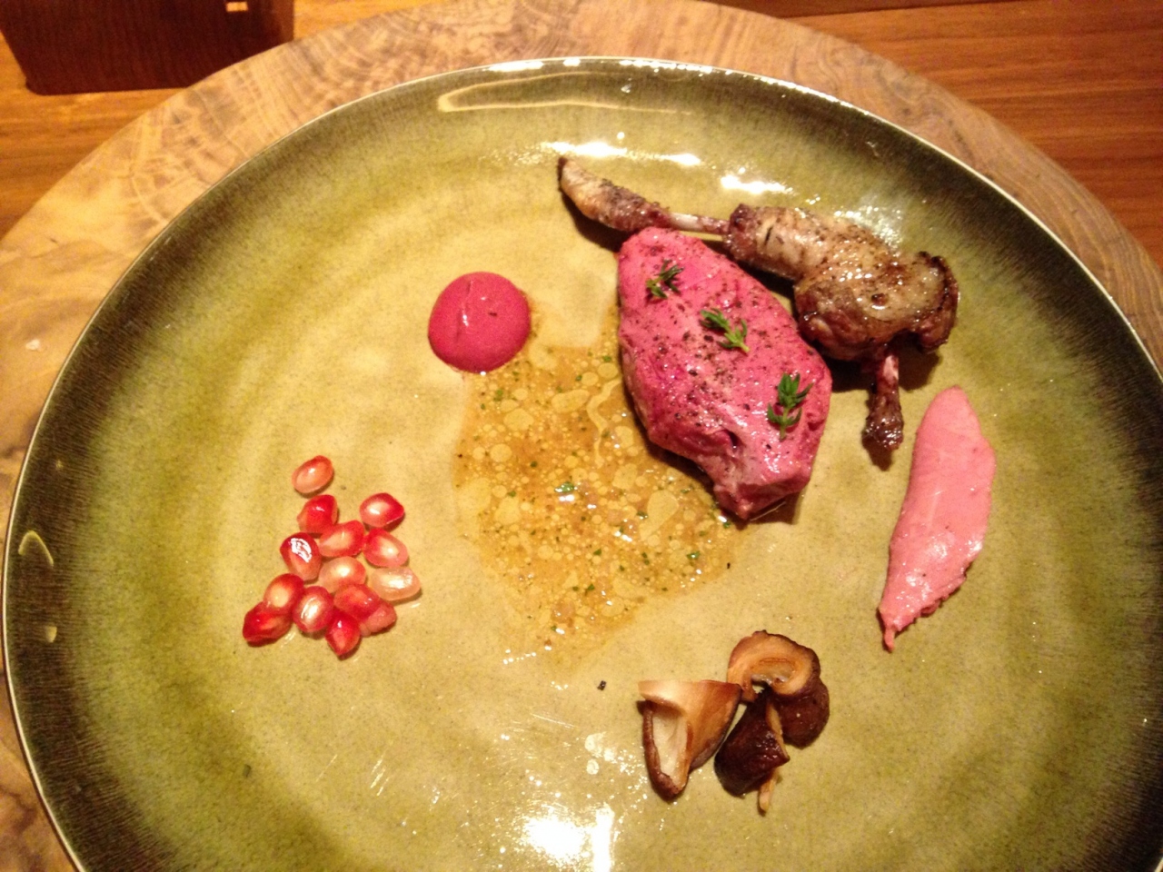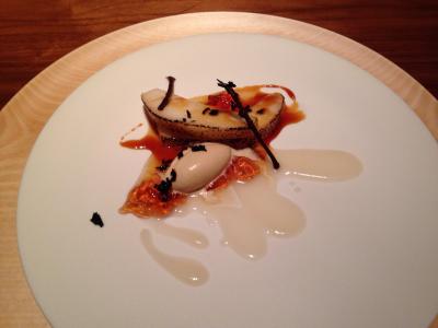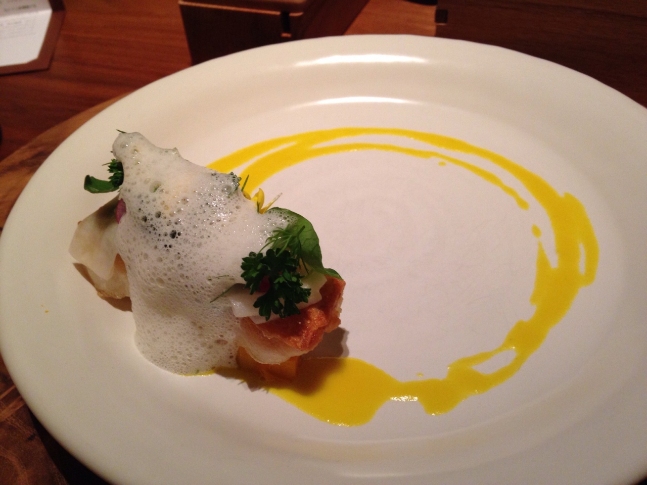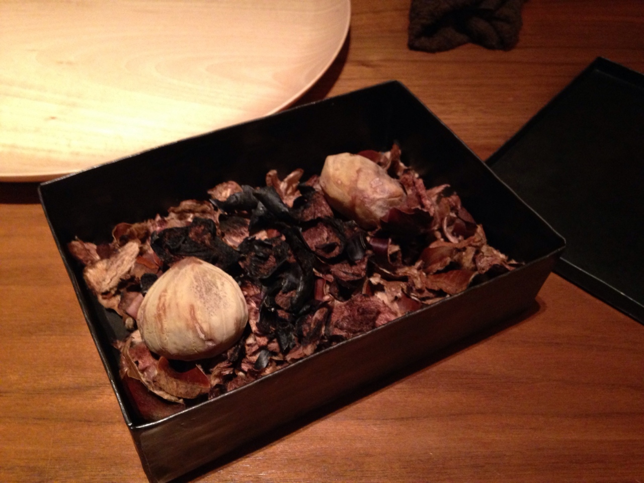 ソムリエの方が気さくな方で色んなお話をさせていただきました。グラスのシャンパンと国産のお水を注文してからコースが始まります。お皿などの器も美しいし、盛り付けも彩りもカラフルで前菜からもう目を奪われます。もちろんとても美味しいです。気泡がたくさん入った栗のパンはスポンジみたいなふわっふわのパンをそのまま頬張ります。面白い!スープ、魚、鳩のお肉、カニのパスタなどがあり、デザートも3種類ほど出てきました。小さ目の箱を持ってきて「開けてみてください」と言われたので開けてみるとふわっと煙が出てきてビックリ。玉手箱の中には大きな焼き栗が入っていました。はぁ~素敵な時間を過ごせました。