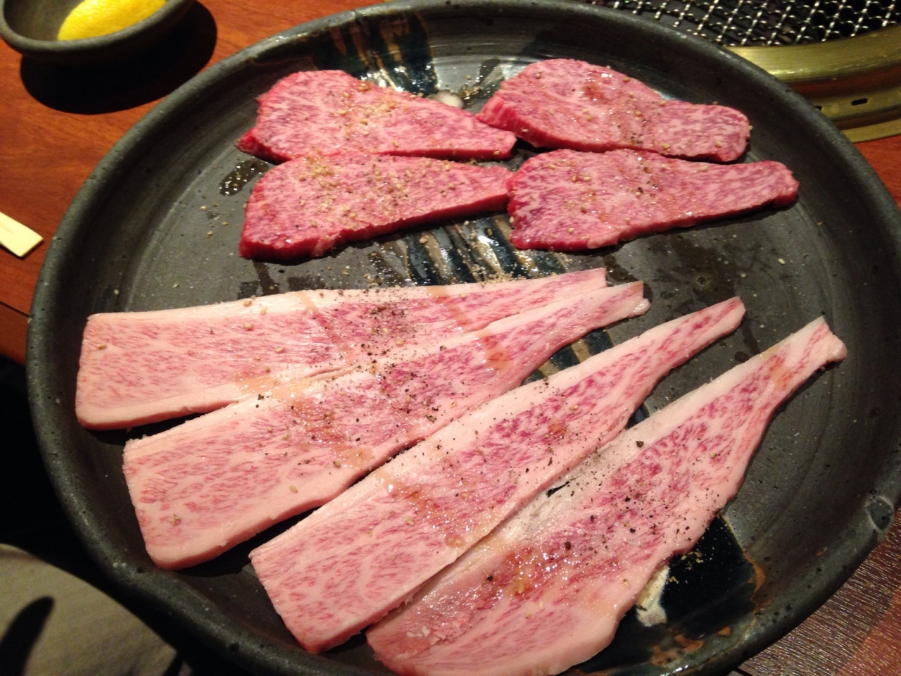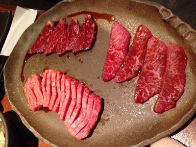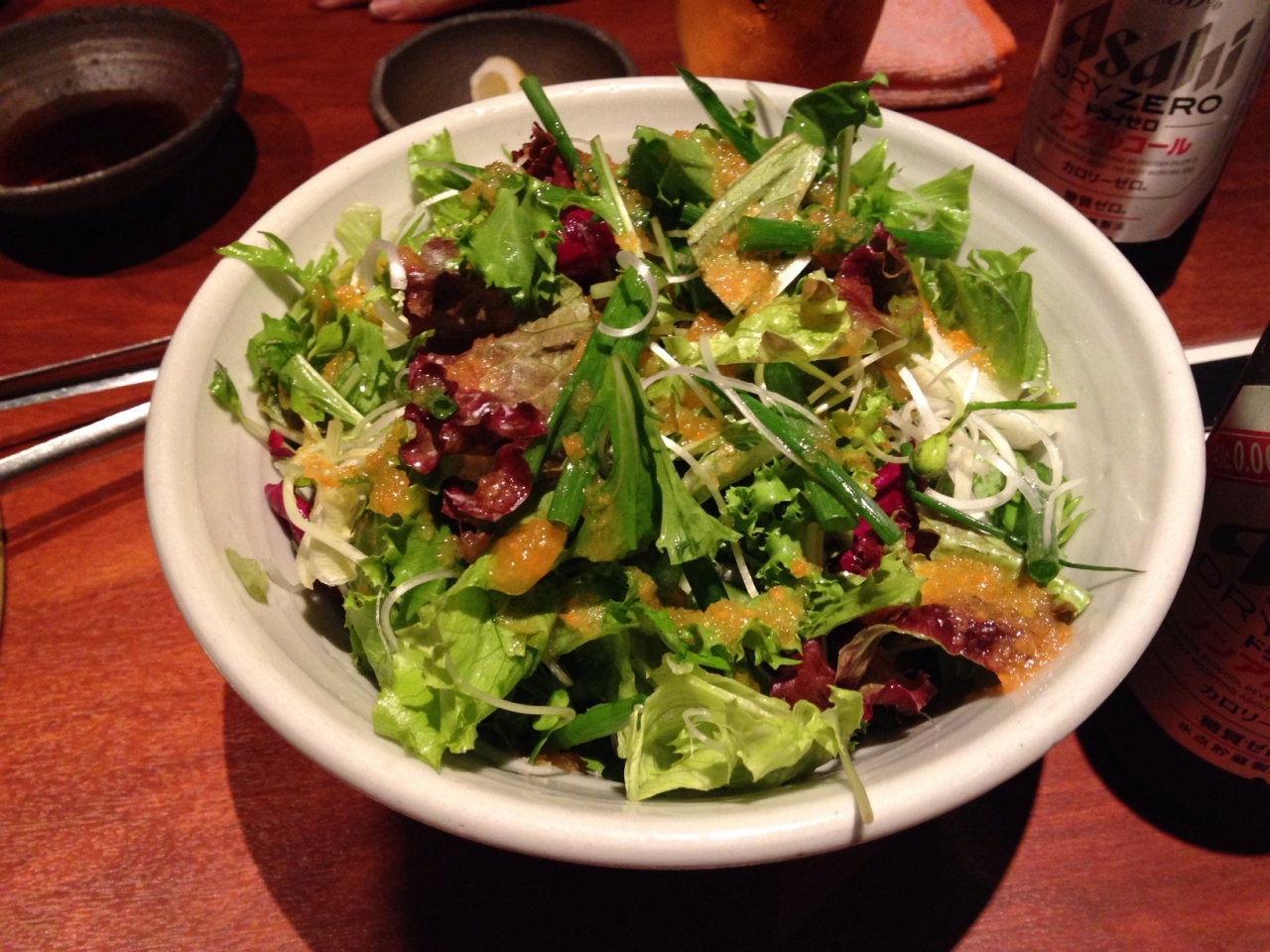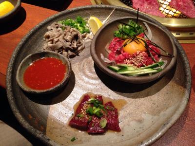 サラダ、レバ刺し、ユッケ、店長のおまかせのお肉、ホルモン、チヂミなどを注文。サラダは少し甘めのドレッシングで、量は4人で食べるには足りない感じ。何とレバ刺し、センマイ刺し、ユッケが頂けました!認定か何かをもらっているとのこと。お肉は店員さんに説明して頂きましたがどれがどのお肉か覚えられず…。でもどれも刺しがいっぱい入った極上のお肉でした。ホルモンは塩かタレかを選べます。