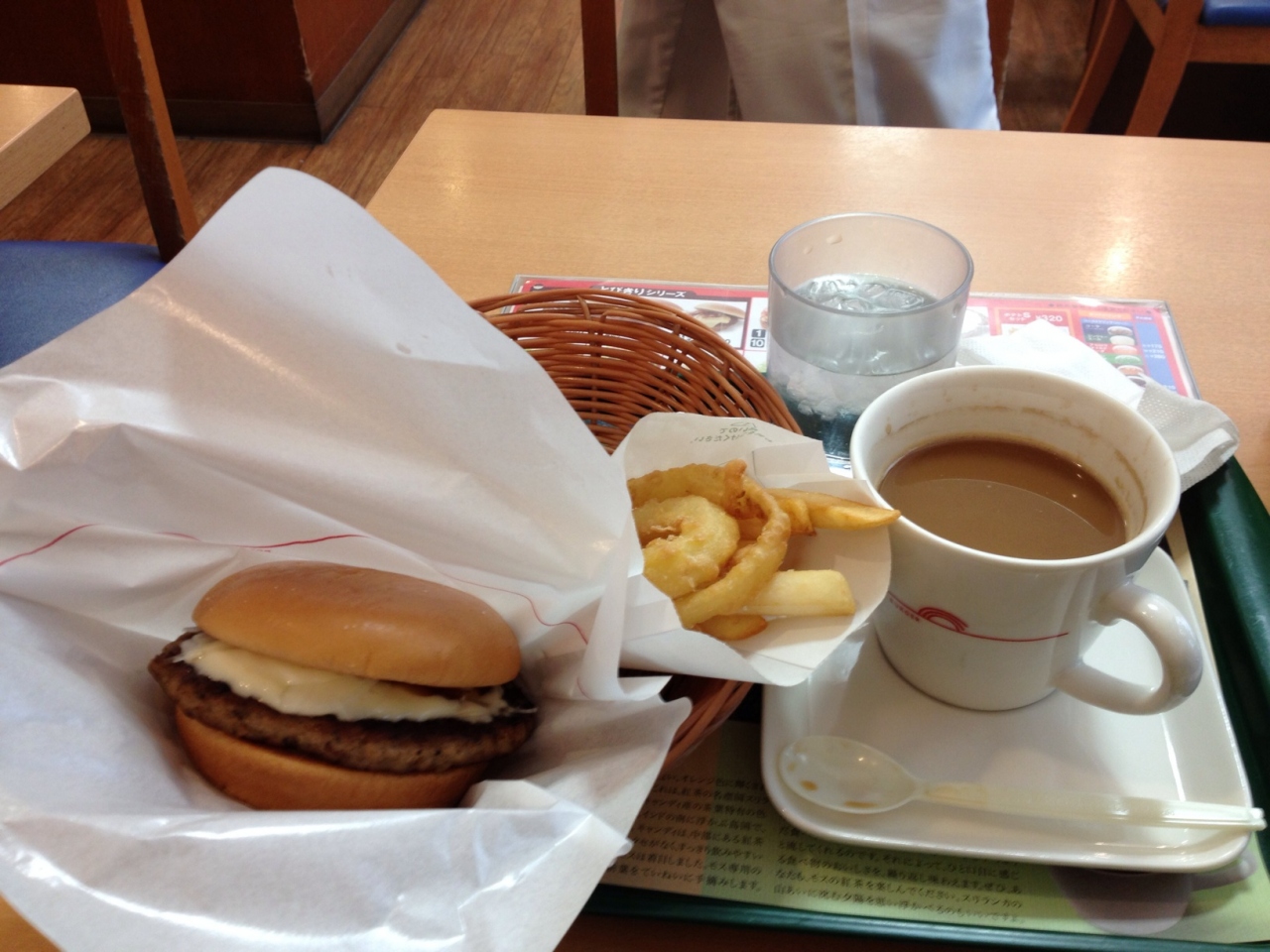 とびきりチーズバーガー、オニポテセット、コーヒーを頼んで席に着いたら席同士の間が狭くて隣の机に当たりそうでドキドキしました。とびきりバーガーは小ぶりなハンバーガーで、肉肉しい味のパテ、てりやきソースのような甘めのソース、トローリ溶けたチーズが美味しかったけど、とびきりか?と言えばそれほどでもなかったかも知れません。- 旅行時期
