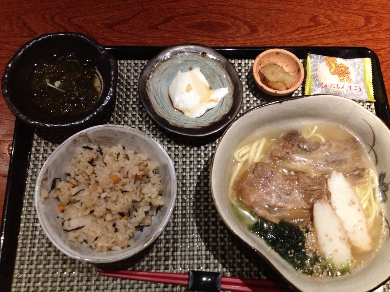 ソーキそば定食はソーキそばに白いご飯かジューシー(炊き込みご飯)が選べます。もちろんジューシーを選びました。濃すぎず美味しかったです。ソーキそばは薄めのかつおだしの他にお肉がとろとろで美味しかったです。他のお客さんはみんなランチメニュー以外に夜の居酒屋メニューからカーリーポテト(くるんと巻いたポテトフライ)を頼んでました。- 旅行時期