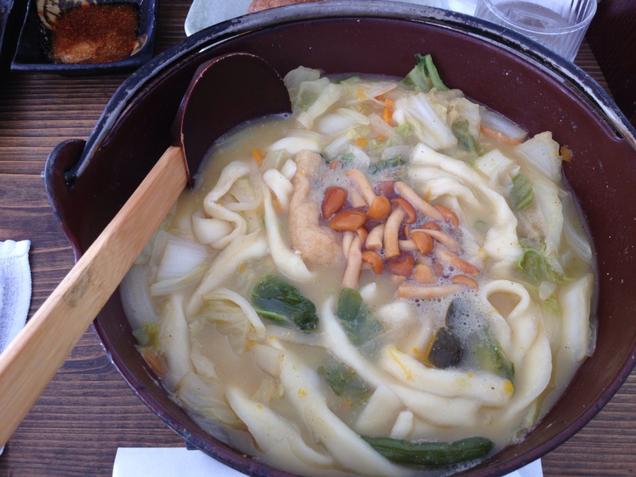 外観の面白さだけでなく、ほうとうがとーっても美味しくてびっくりしました。大きな鉄なべの中身は野菜がいっぱい。麺はぼこぼこした形で食べごたえがあり、だしが効いていてスープ飲み干したい!と思ったほど。でも量が多すぎて一人では食べきれません。他にも馬刺し、お稲荷さんを頼みましたが、ほうとうは一つで良かったかなと思いました。