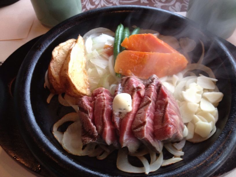 夫べた褒めの前菜はハムが柔らかく、玉ねぎの上に掛かっているドレッシングが何とも言えず美味しいのです。ヒレステーキは切れた状態で出てきて、アツアツの鉄板の上に自分でお肉を広げつつ焼きながら食べます。野菜もとても甘いし、お肉はとっても柔らかくて、しかもお箸で食べられるので気楽です。また行きたいなぁと思いました。- 旅行時期