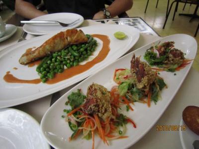 私はウィークエンドスペシャルを注文(15USD)。ソフトシェルクラブのサラダにシーバスソテー。初めて食べたソフトシェルクラブは柔らかくてドキドキしたけど美味しかった!どちらもボリューム満点、お味も最高。デザートもついてます。- 旅行時期