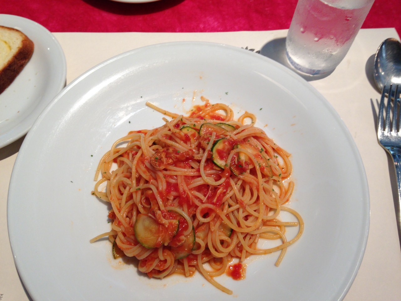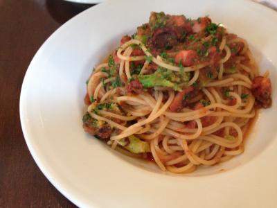 パスタはタコとブロッコリーのトマトパスタ、ピッツァはマルゲリータにしたら、ピッツァがとーっても美味しかったです。焦げ目がついた生地はパリパリのモチモチ。ただなぜだかオリーブオイルが振りかけられてきていたようでベタベタになるほどでした。オリーブオイルは体に良いとは思いますがあれほど掛けるかな?というくらいでした。でもそれを入れても美味しかったと思いました。パンもついています。