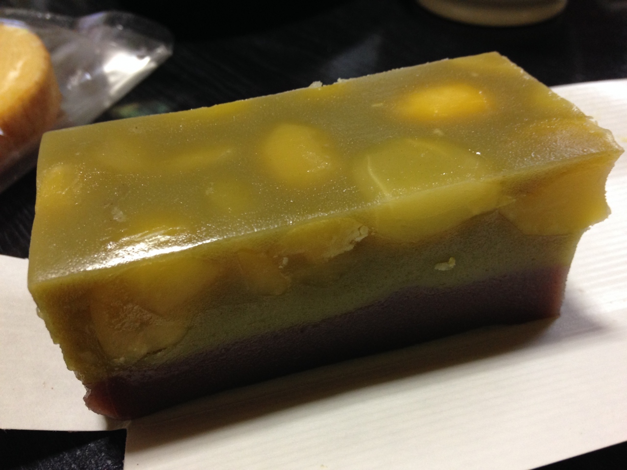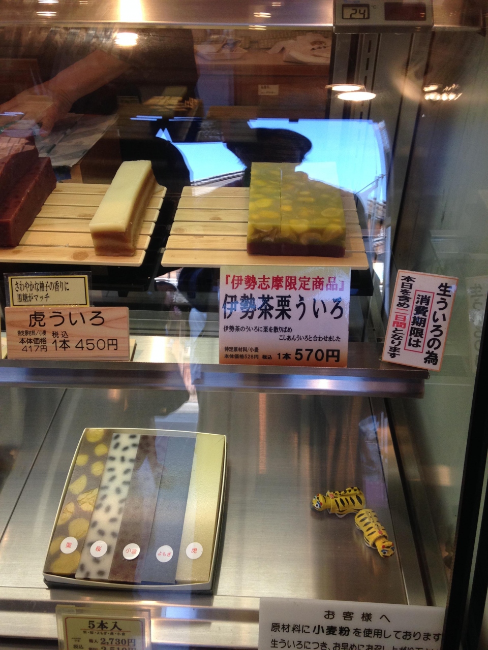 単純なういろも美味しいのですが、今回は珍しい伊勢茶栗ういろを買いました。大きな甘い栗がごろごろ入って、その下は伊勢茶のういろ、一番下は黒いういろが3層になっています。黒いういろは黒蜜かな。特に栗と伊勢茶のういろがお茶の味がして美味しい~!!これは買って正解でした。他にさくらとか気になるものもありましたが伊勢茶栗が良かったです!